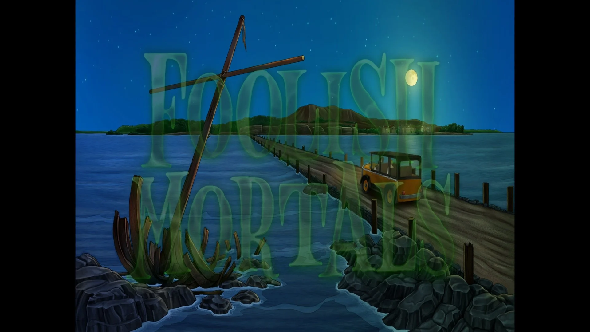 Foolish Mortals introduction with its title that appears in green letters against a background that contains a yellow car driving along a costal road,