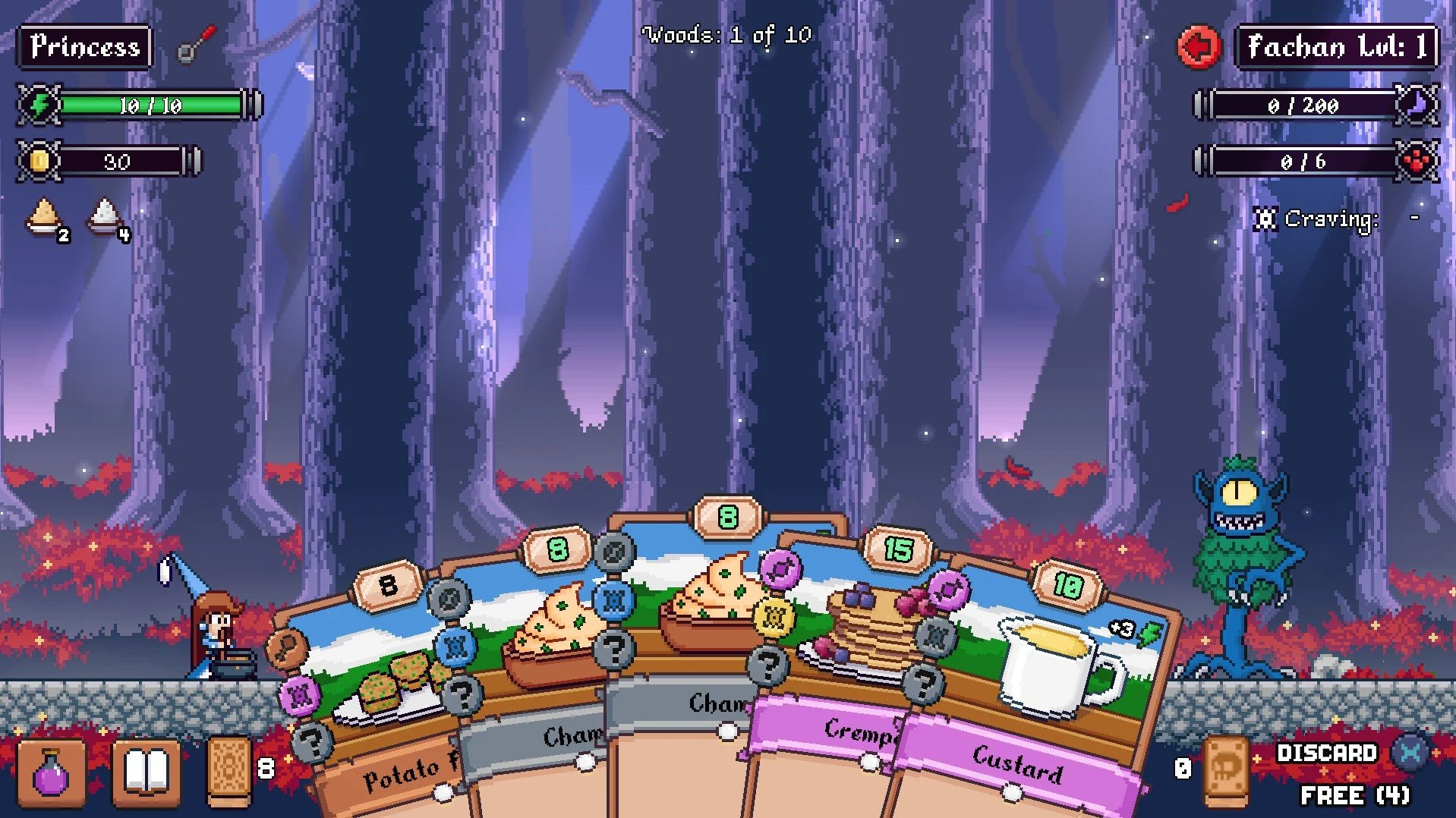 One of the selling points for Hungry Horrors is without a doubt the pixel art. The game employs an expressive and charming cartoon style. Of note, each monster has a unique death animation for the Princess when they cross the field that kinda makes losing fun. Plus there are so many other details. One of my favorites is for a monster called a puca, whose eyes become hearts upon receiving their favorite dish. The dishes themselves are lovingly recreated on their cards, and are lovely to look at. I even have a favorite, the Crempang with all it’s pink and icing (maybe I’m a monster myself)