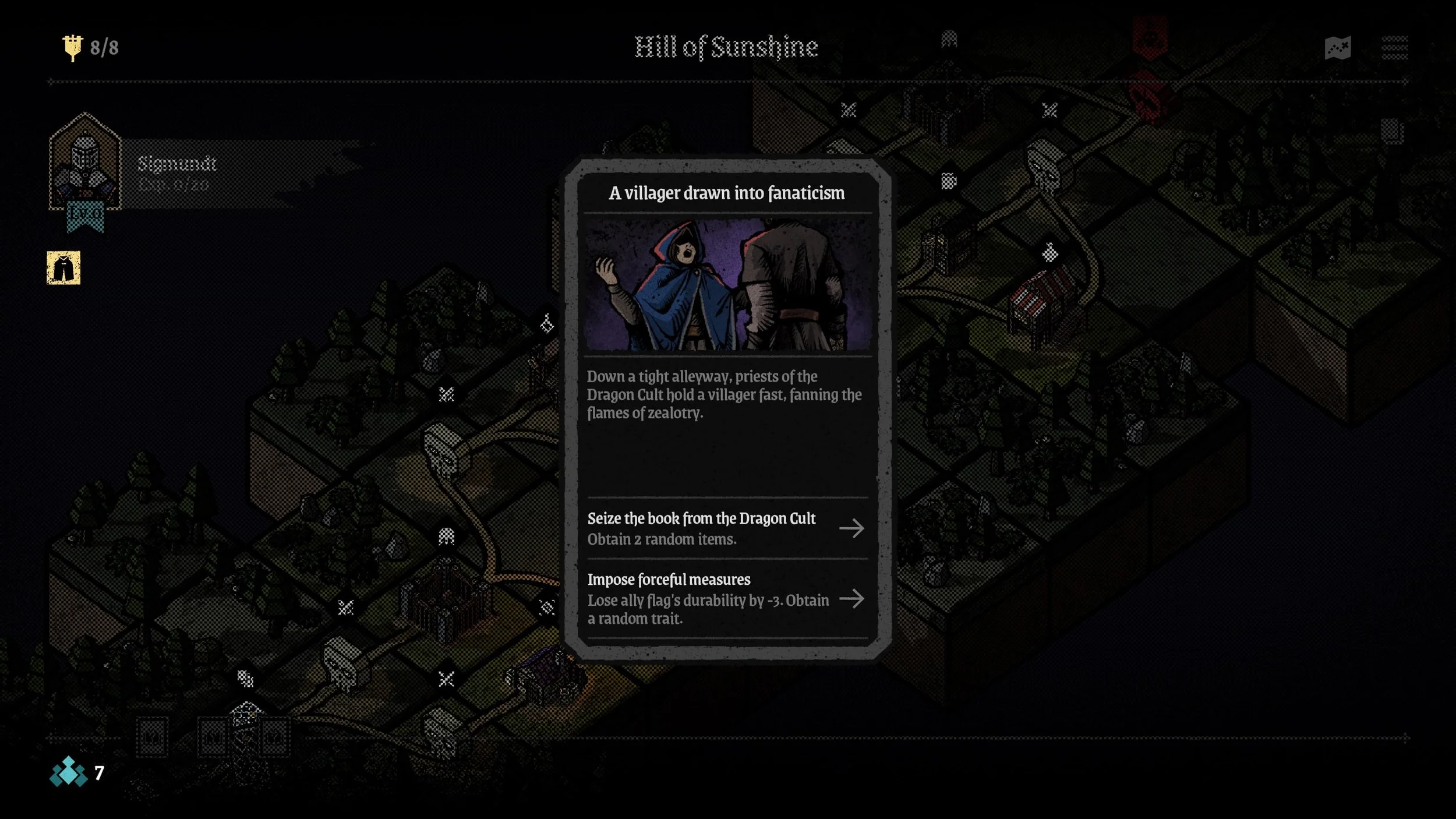 The Gothic medieval presentation really stands out. Mercenaries resemble painted, carved wooden miniatures, hopping across battlefield grids that feel like a tabletop war game. The sharp, angular art direction of the 3D models extends to the UI, which is both attractive and intuitive. The tactile, board game-inspired aesthetic reinforces the strategic focus and gives Master of Piece a distinctive identity among similar roguelites.