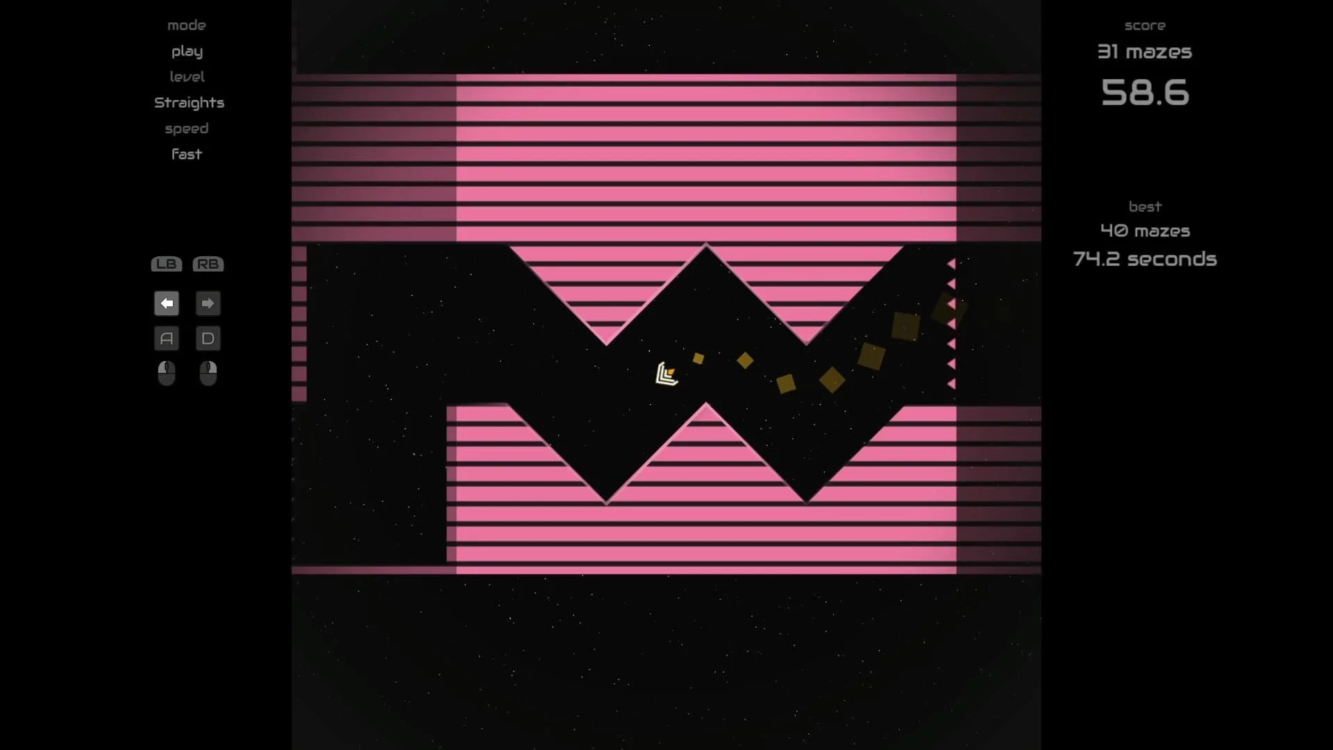 CD: I knew it had to be as easy as possible to restart when you crash. Any friction there would give players a chance to stop playing. I also wanted to challenge the player to do better. The main crash speech, “the maze wins,” dares you to do better. The somewhat annoying robot voice probably also helps with this. It was created with a 25-year-old speech synth in FL Studio, and initially, it was just a placeholder until I found time to properly record the speech. During development, it quickly became part of the feel of the game, an invisible antagonist, so I decided to keep it.