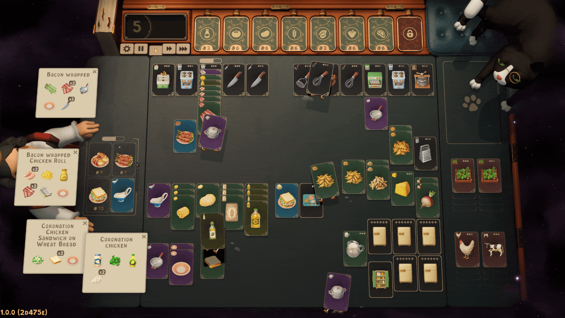 The challenge is relatively low. You can pause time freely to rearrange your cards, which feels necessary to avoid frustration but also removes much of the pressure. Ingredients arrive randomly in card packs; if you’re unlucky, you can sell unwanted cards with no downside. This safety net makes the randomness feel inconsequential, and I would have preferred the option to buy specific cards directly instead.