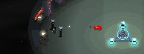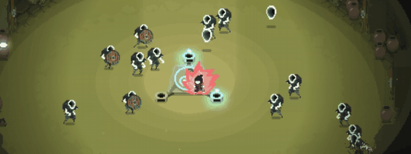 All the sprites in the game are very small, but they’re fluidly animated, which increases the amount of detail you perceive. The size is essential for the game’s design, as it allows for more freedom of movement in combat and more interesting situations based on the arrangement of the enemies, since you can see more of the battlefield at one time. Each floor is the same—the arena is round, with plain ground, only differentiated by the style of the walls. Other environments, such as the hub and places in cutscenes, are more richly detailed.