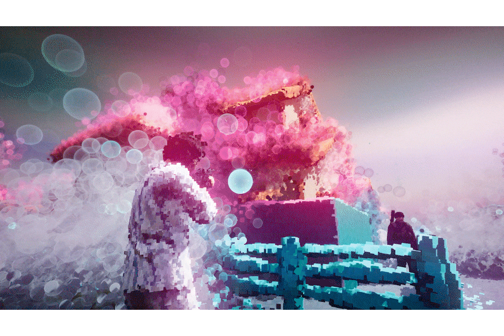 The core gameplay loop involves shooting at the abstract, particle-filled environment to form coalescent objects and scenery; for this canvas, a machine gun, grenades, and a rocket launcher are your brushes—tools of destruction used here for creation. Areas start as hazy clouds of circles that resemble a bokeh effect, the blur in the out-of-focus parts of a photograph. As you shoot into these forms, particles shrink and rearrange into buildings, walls, characters, and anything else that might be in the scene. Occasionally, you run into “boss fights,” where an object’s aura becomes disturbed, and you have to shoot its weak points to have it return. These amount to target practice; there’s no danger of harm to your character.