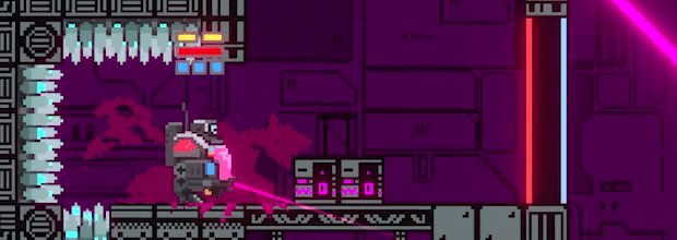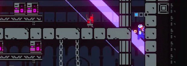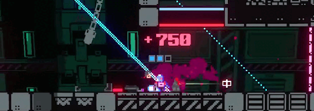 The pixel art is simple, with nearly monochromatic art for the levels. Highlights come from the small sprites, brightly colored hazards, and the neon pink sprays of blood. Bullets, shattered glass, and other particles constantly fly, and the visual design keeps the action clear. These are graphics you can only truly appreciate when they’re in motion. It’s got a great look, complemented by the fitting synth soundtrack that accompanies the bombastic sound effects.